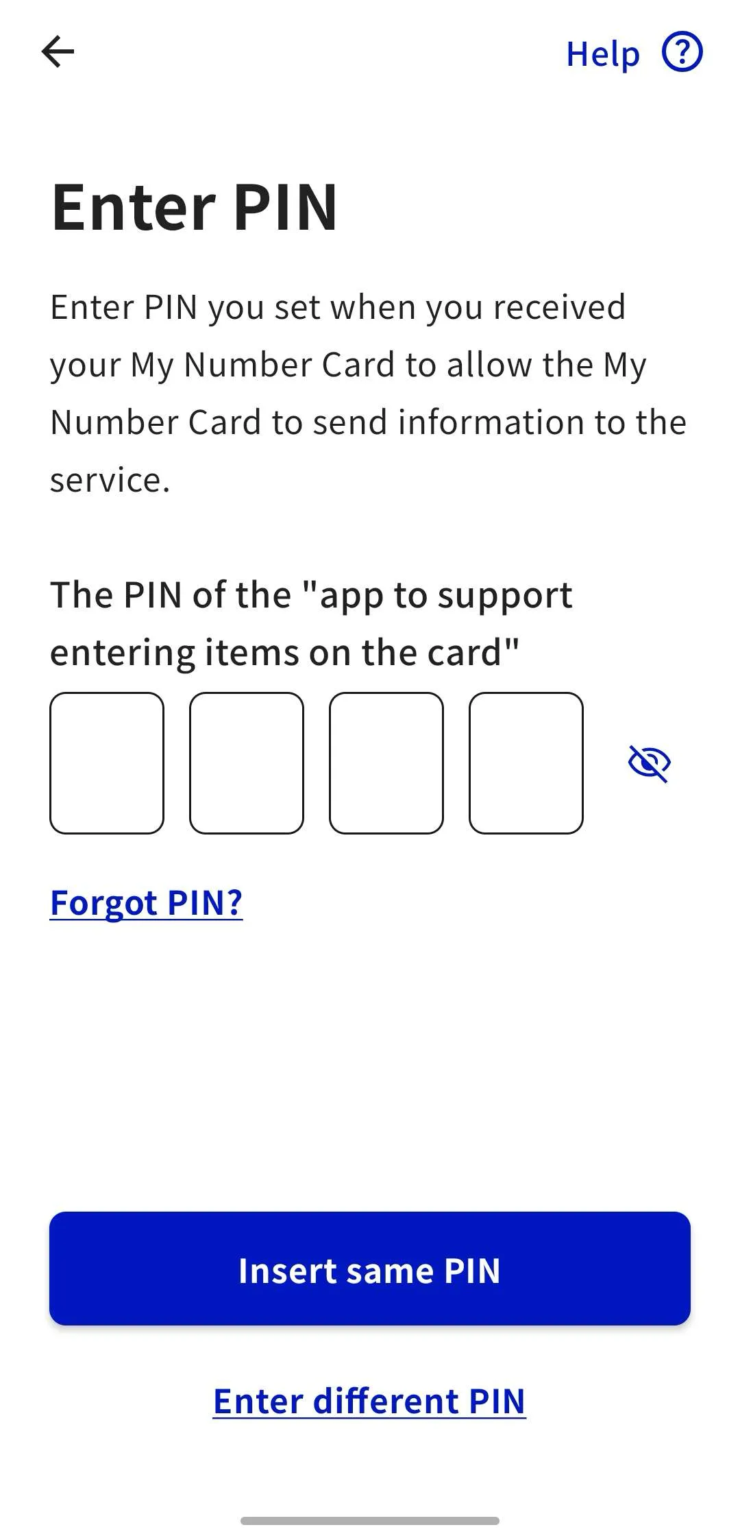 6. Enter the PIN of the “app to support entering items on the card” (previously referred to as “PIN for Card Info Input Support”). If it is the same as the previous PIN, you can skip this step by tapping “Insert same PIN”.