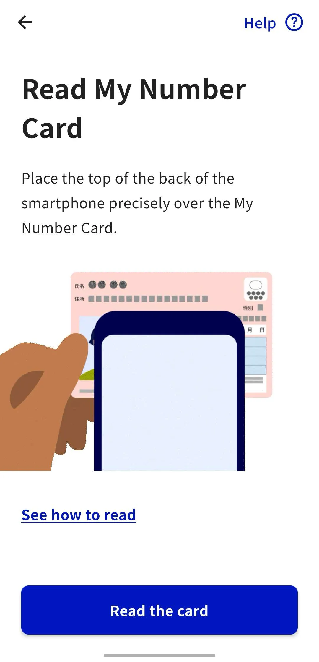 7. Follow the instructions in the app, tap the “Read the card” button, and scan your My Number Card with your smartphone.
