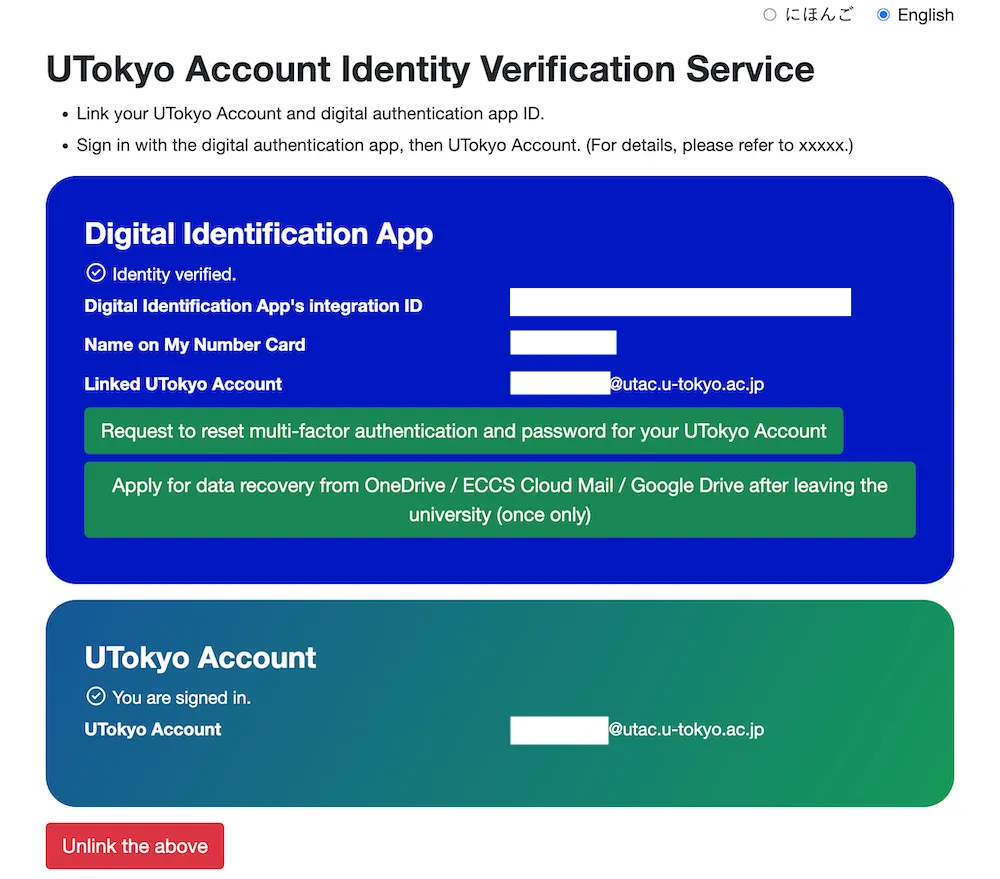 You can check the link status on the UTokyo Account Identity Verification Service or the “View Your UTokyo Account User Information” site.