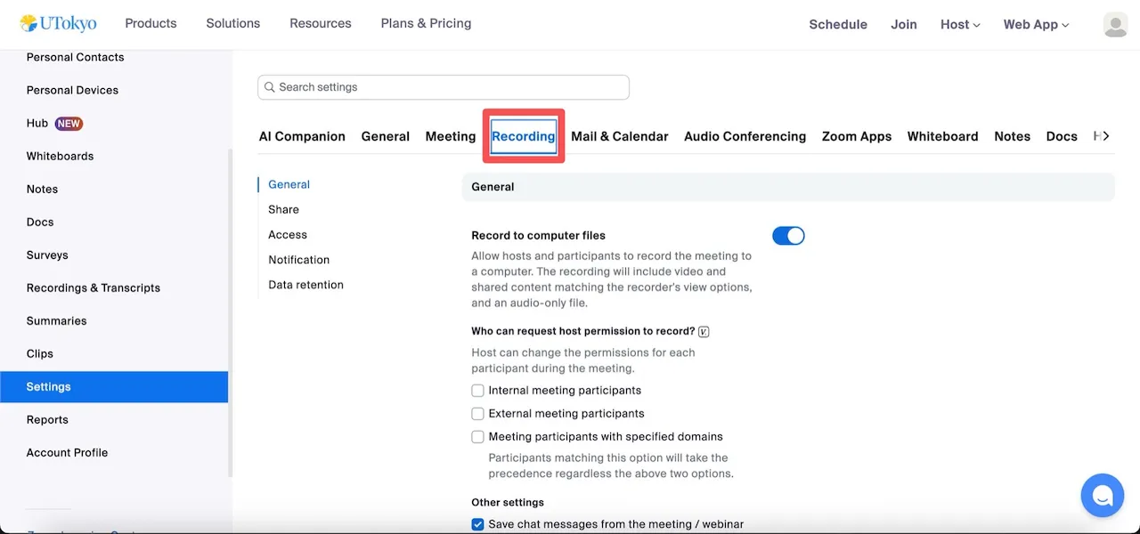 2. Open “Recording” from “Settings” in the web portal.
