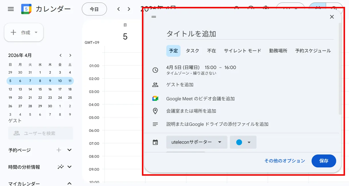 1. 予定を入れたい時間帯または左上にある「作成」を押してください.下の画像の赤枠部分のような画面が表示されます.