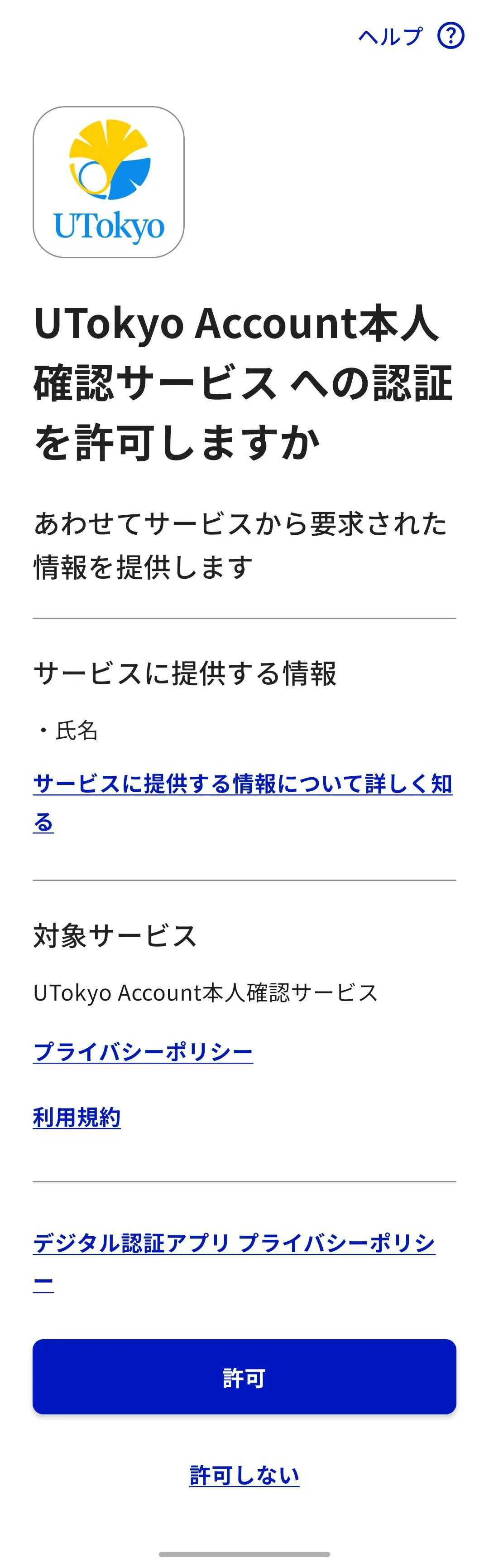 UTokyo Account本人確認サービスへの認証の許可を求める画面が表示されます.プライバシーポリシーや利用規約を確認の上,「許可」ボタンを押してください.