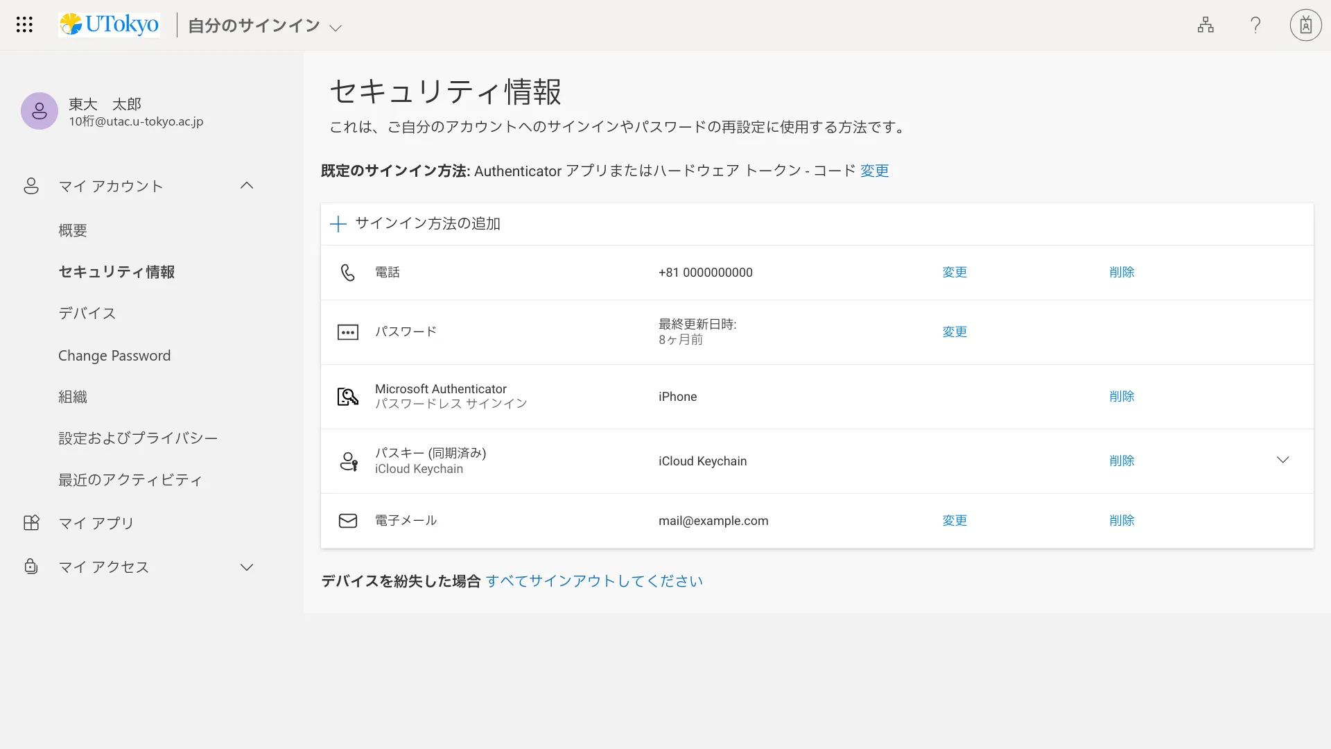 特に,機種変更の際は,古いスマホが利用できるうちに,「UTokyo Account多要素認証の本人確認方法の登録変更手順」に従って新しいスマホを追加登録してください.スマホを処分すると認証アプリによる本人確認はできなくなりますし,電話番号が変わると電話番号による本人確認はできなくなります.登録の変更をする際にもサインイン時の本人確認は必要となるので,本人確認できずにUTokyo Accountにサインインできないという事態にならないよう,必ず事前に変更を行うことが重要です.