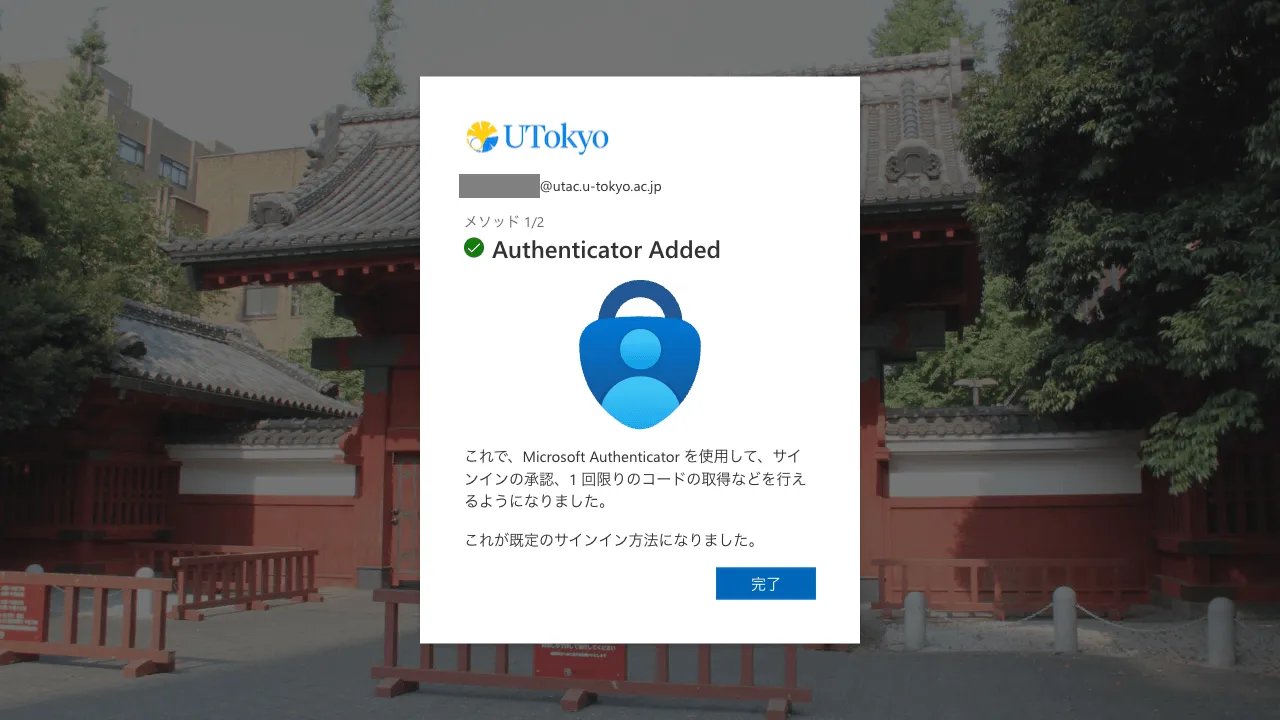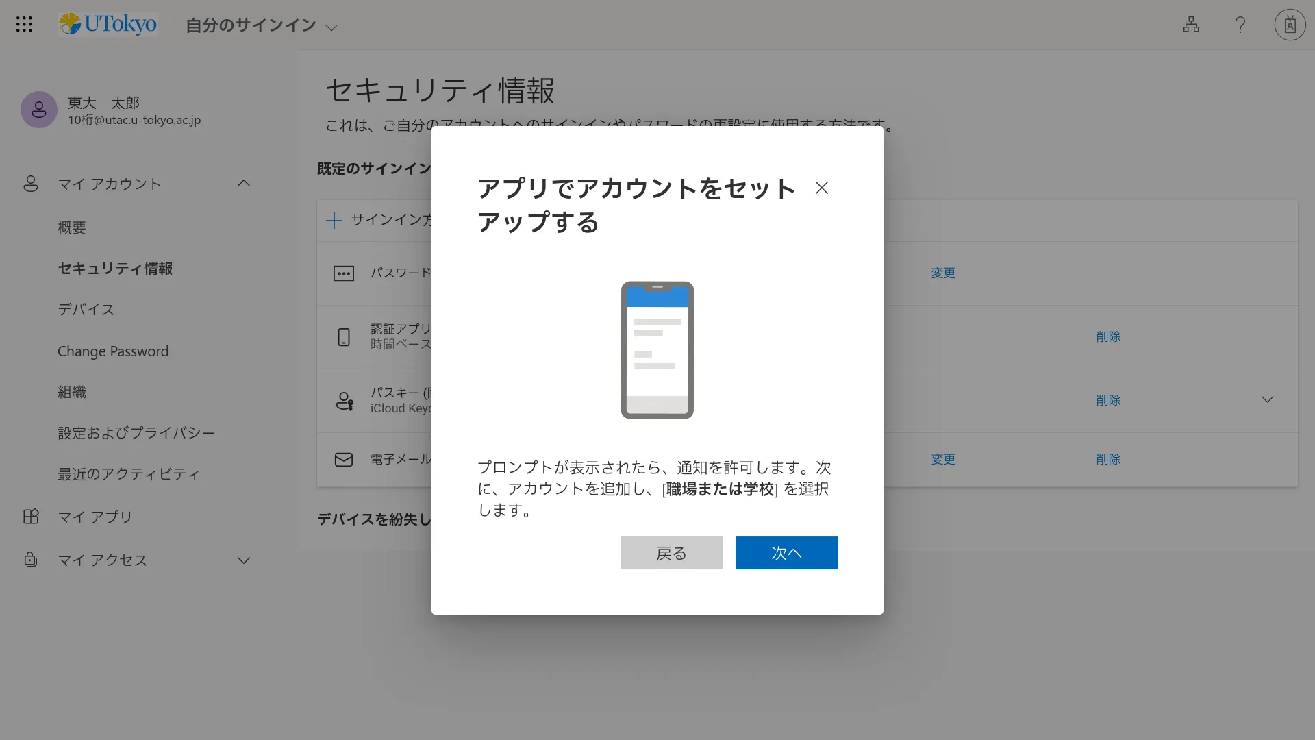 手順を終えると,その後UTokyo Accountにサインインする際,毎回,設定したSMSや専用のアプリなどで本人確認することが求められます.登録した本人確認方法(スマホのアプリや電話番号)が利用できない状態ではUTokyo Accountにサインインすることができなくなりますので,十分ご注意ください.