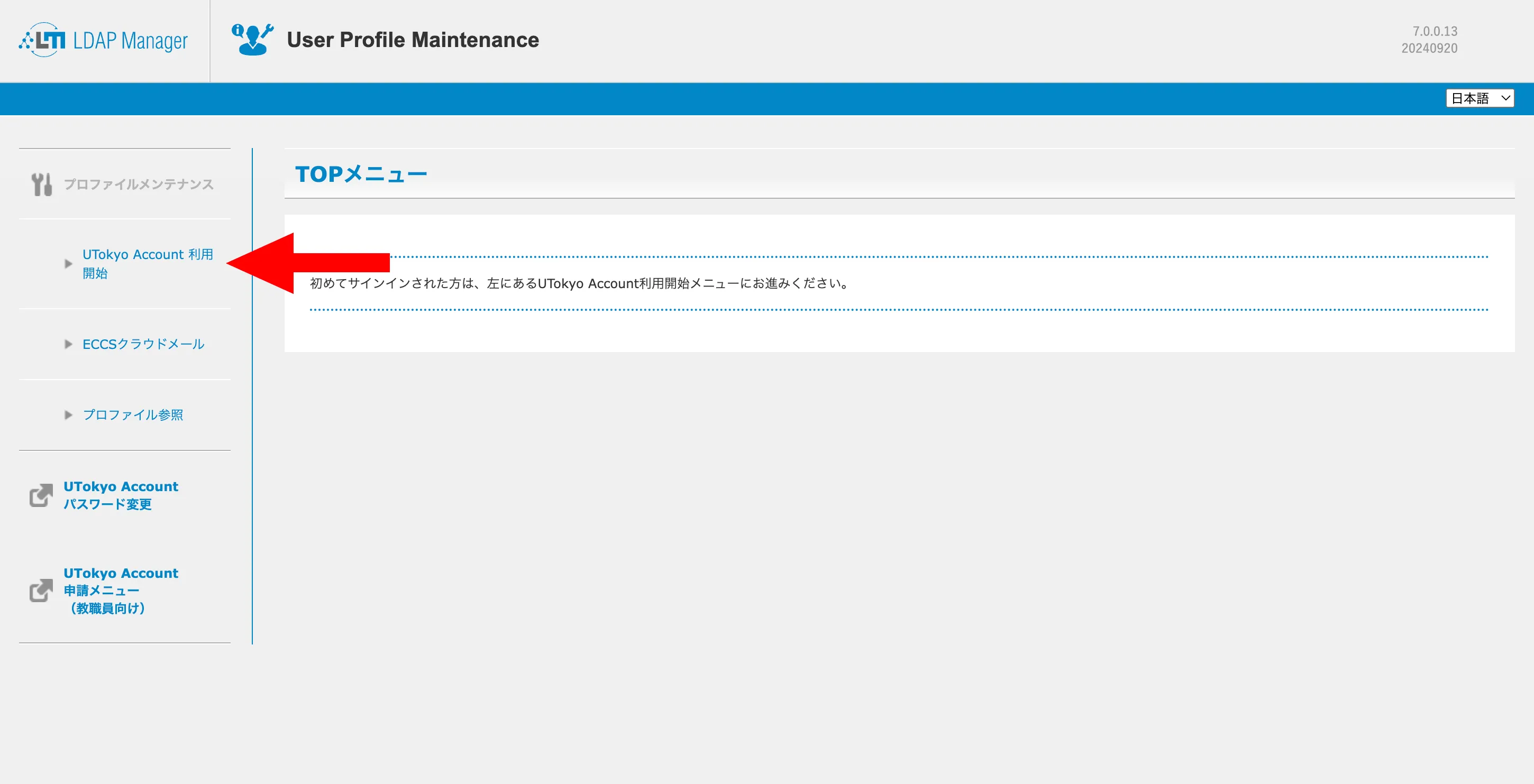 3. 左のメニューにある「UTokyo Account利用開始」を押してください.