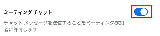 - 「ミーティング内(基本)」内の「ミーティングチャット」の項目をオンにしてください.
