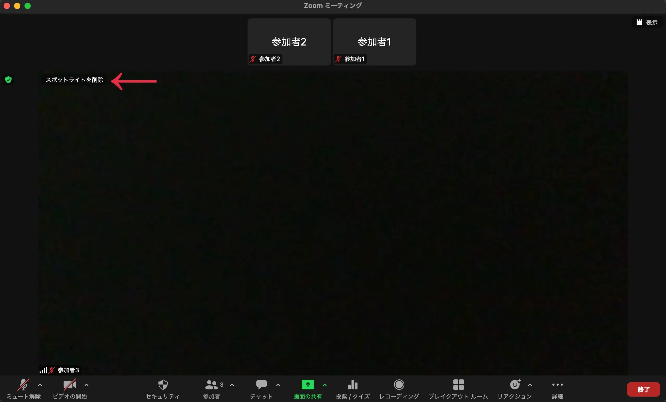- 画面上部に「参加者が見ることができるのは,ホスト,共同ホスト,およびスポットライトされたユーザーだけです」という通知が表示されれば正しく設定できています.